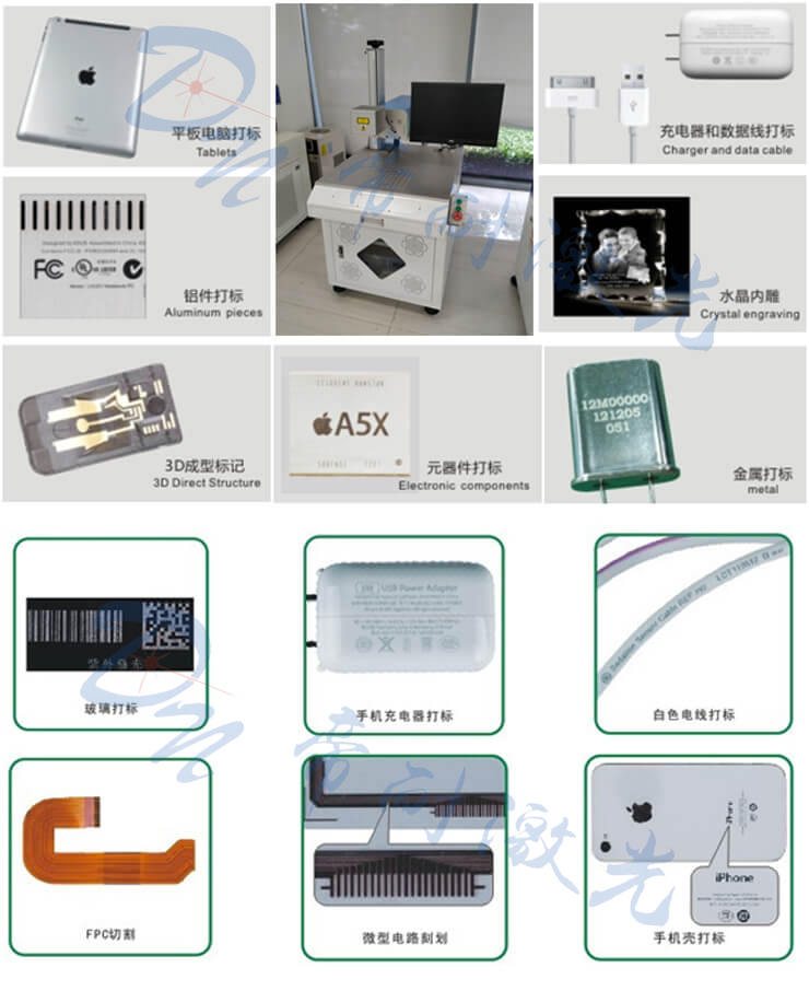 廣泛應(yīng)用于LCD液晶玻璃,LED基片,藍寶石基片,半導(dǎo)體晶圓,F(xiàn)PC柔性電路板,消費類電子產(chǎn)品,手機部件,陶瓷等的二維碼以及數(shù)字字母精細(xì)打標(biāo),ITO刻膜等行業(yè)。